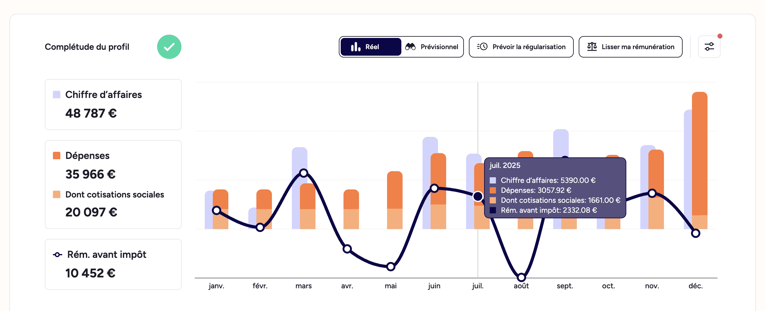 En mode prévisionnel : projection de votre activité de janvier jusqu’au 31 décembre, en se basant sur vos recettes et dépenses depuis le début de l’année.