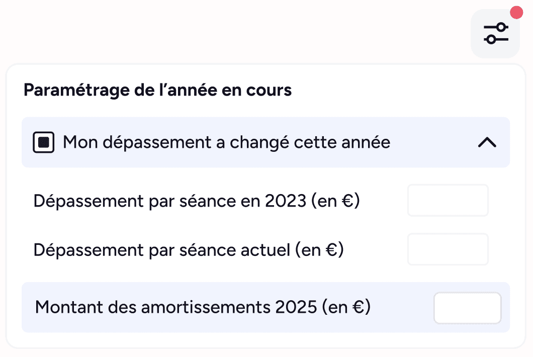 Évolution du dépassement d’honoraires : vous pouvez mentionner une variation de votre DE ou HN par rapport à l’année précédente (en € par séance). Cela ajuste la projection de vos revenus sur l’année en cours selon l’évolution moyenne estimée de vos honoraires.