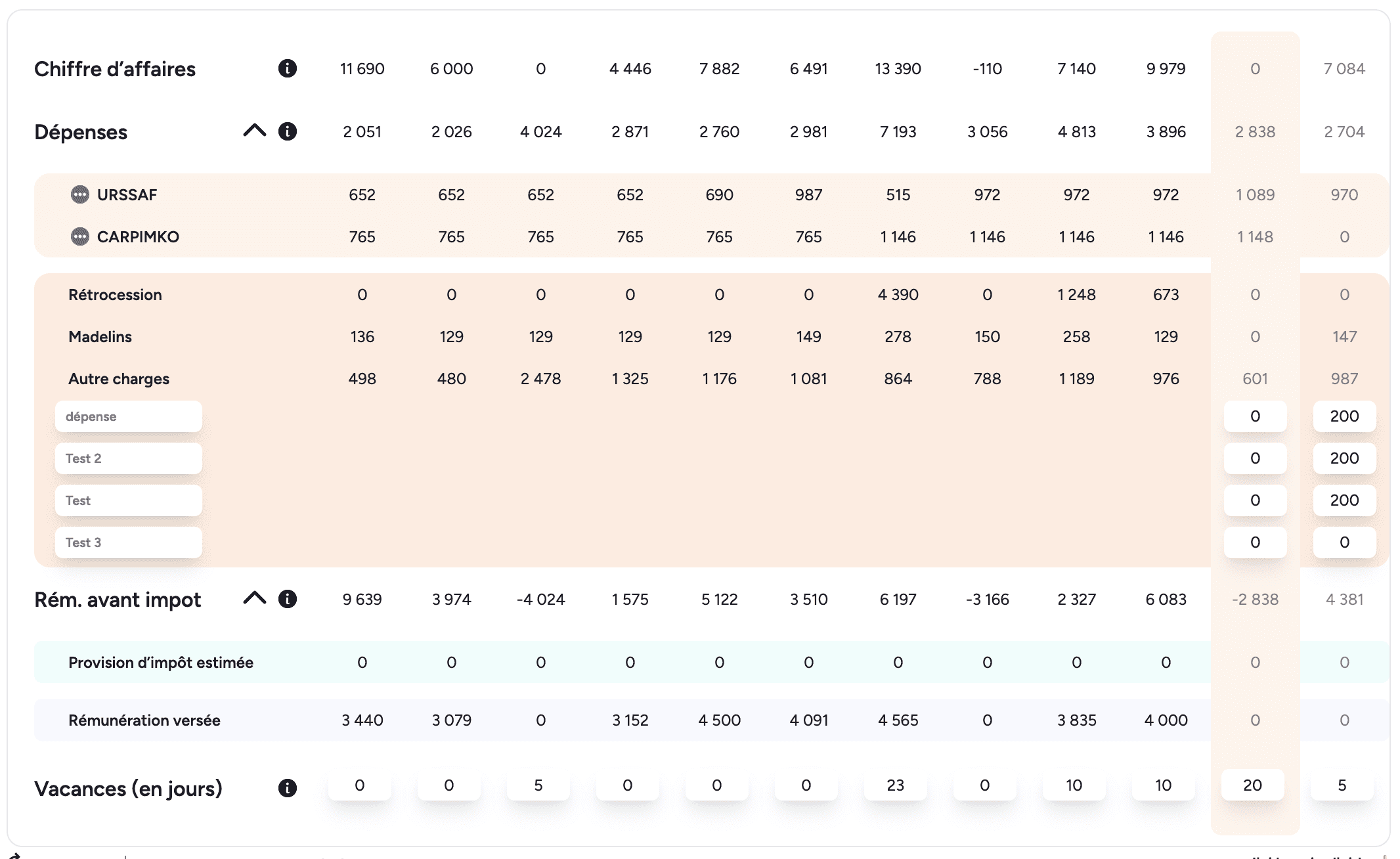 Cette section est le tableau de bord de votre activité professionnelle. Elle vous permet de suivre vos revenus, vos dépenses, votre rémunération et ajuster vos vacances au même endroit.